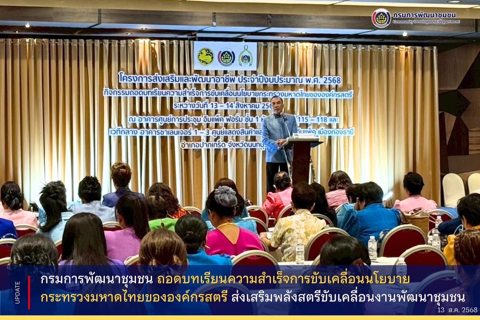 วันที่ 13 สิงหาคม 2568 เวลา 09.00 น. ณ อาคารอิมแพ็ค ฟอรั่ม เมืองทองธานี นายวรงค์ แสงเมือง รองอธิบดีกรมการพัฒนาชุมชน เป็นประธานในพิธีเปิดการประชุมเชิงปฏิบัติการส่งเสริมบทบาทองค์กรสตรีสู่การเป็นเลิศ ผู้นำการขับเคลื่อนงานพัฒนาชุมชน โดยเป็นกิจกรรมภายใต้โครงการส่งเสริมและพัฒนาอาชีพ ประจำปีงบประมาณ พ.ศ. 2568 กิจกรรมถอดบทเรียนความสำเร็จการขับเคลื่อนนโยบายกระทรวงมหาดไทยขององค์กรสตรี ในการนี้ นายอาทร พิมชะนก ผู้อำนวยการศูนย์สารสนเทศเพื่อการพัฒนาชุมชน ได้มอบหมายให้ นางสาวประภาพรรณ วุ่นสุข ผู้อำนวยการกลุ่มงานพัฒนาระบบเทคโนโลยีสารสนเทศ เข้าร่วมพิธีเปิดการประชุมฯ โดยกลุ่มเป้าหมายเข้าร่วม จำนวน 315 คน ประกอบด้วยสตรีดีเด่นในการสนับสนุนการขับเคลื่อนนโยบายและภารกิจสำคัญกระทรวงมหาดไทย จำนวน 152 คน ประธานคณะกรรมการสตรีจังหวัด จำนวน 76 คน และเจ้าหน้าที่พัฒนาชุมชน จำนวน 87 คน จัดขึ้นโดยสำนักเสริมสร้างความเข้มแข็งชุมชน กรมการพัฒนาชุมชน